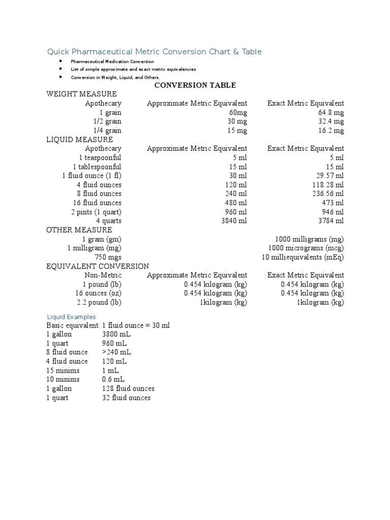Pharmacy Conversion Charts - This chart lists the most common conversions used in pharmacy practice. These should be committed to. Conversions pharmacological calculations are reliant on specific systems of measure and the technician’s ability to. An introduction for pharmacy technicians. Home > trainee pharmacist > pharmacy units of measurement and unit conversions.